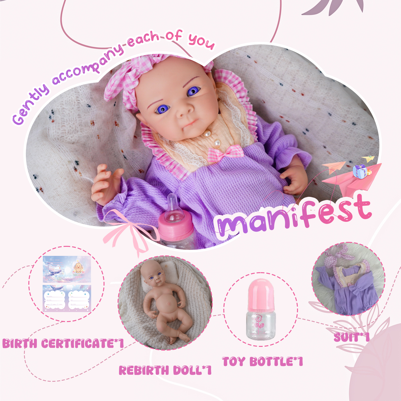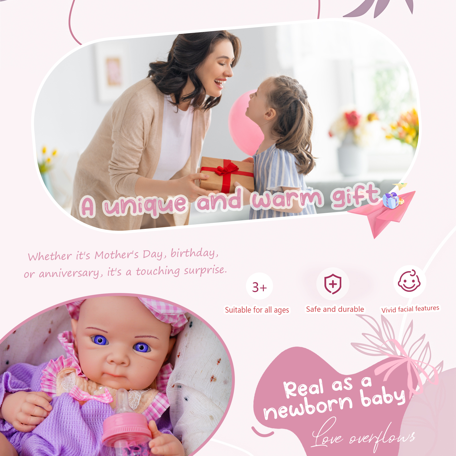 Reborn baby dolls silicone full body is made of high-quality silica gel, which meets the requirements of Children’s Product Certificate, safe, soft, non-toxic, tasteless and environmentally friendly. Durable dolls. Pacify the Doll. Pacify the Doll, Accompany the Doll,The lifelike reborn baby doll has real skin texture and facial features, soft touch.
